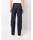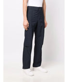 - navy - cotton - seersucker weave - two side slit pockets - side pouch pockets - rear button-fastening jetted pocket - high waist - straight leg - zip fly fastening