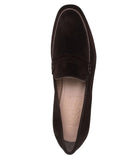 - coffee brown - calf suede - penny slot - apron toe - almond toe - contrast stitching - low stacked heel - branded leather insole