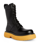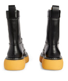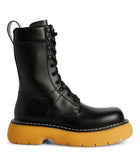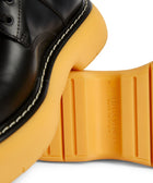 The Bottega Veneta Leather Bounce Boot is crafted from luxurious black calfskin. This boot features a sleek design with a distinctive bounce sole, combining modern style with comfort, and reflecting the brand's dedication to high-quality materials and expert craftsmanship.