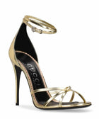 Sleek metallic-finish leather, open-toe strappy design with an adjustable ankle strap, and a high heel for a polished, glamorous look. Perfect for evening wear or special occasions.